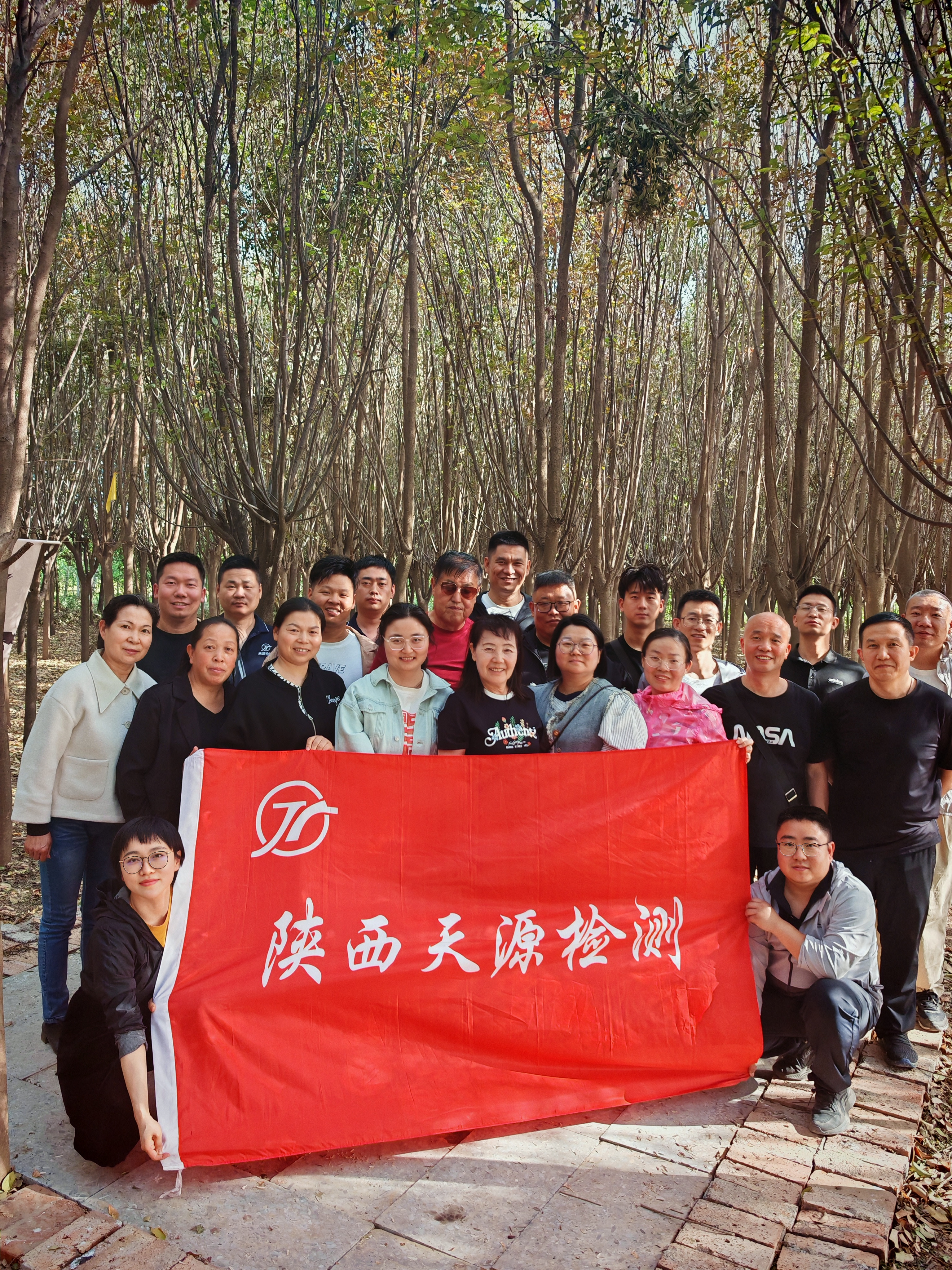 2025年4月29日,陕西天源检测公司机关员工齐聚西安白鹿塬,开展了一场意义非凡的团建活动。在春意盎然的树林间,大家心情愉悦,留下了珍贵的合影(如视频截图所示,员工们共同举着印有公司名称的旗帜,展现出团结的风貌)。